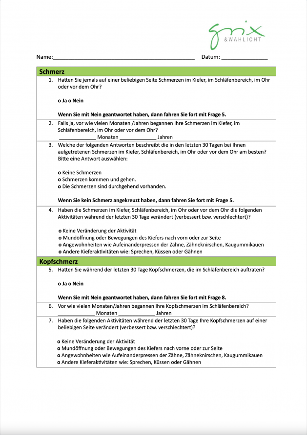 Bitte füllen Sie den Kiefer-Fragebogen vor Ihrem Besuch aus. Dies ermöglicht einen zügigen Beginn der Behandlung, da wir bereits alle nötigen Informationen zu Ihrem Zustand haben. Ihr Termin wird effizienter und wir können uns sofort auf Ihre Behandlung konzentrieren.