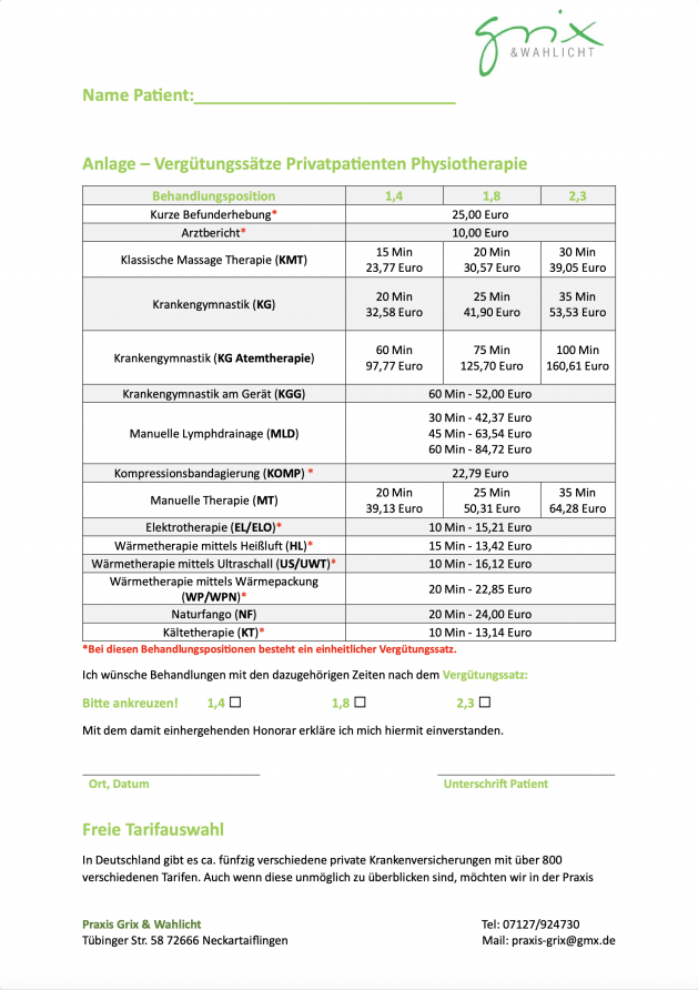 Durch das Ausfüllen der Honorarvereinbarung stellen Sie sicher, dass Ihre Behandlung auf Ihren finanziellen Rahmen und Ihre Bedürfnisse zugeschnitten ist. In unserer Praxis können Sie zwischen verschiedenen Steigerungssätzen wählen, die nach der Gebührenverordnung für Therapeuten (GebüTh) festgelegt sind. Dies ermöglicht es Ihnen, die Dauer und Intensität Ihrer Therapie gemäß Ihrem eigenen Budget zu planen. Eine bewusste Entscheidung für einen bestimmten Satz beeinflusst direkt die Zeit, die Ihr Therapeut für Sie einplanen kann, und somit die Qualität Ihrer Behandlung.